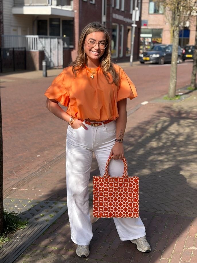 De ballonmouwen zorgen voor een elegant volume, terwijl de cropped fit je taille mooi accentueert. Draag deze oranje top met een high-waisted jeans, rok of short voor een moeiteloos stijlvolle outfit.