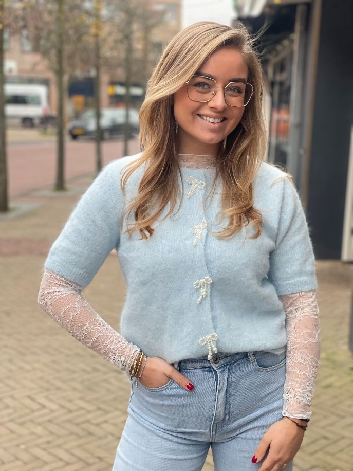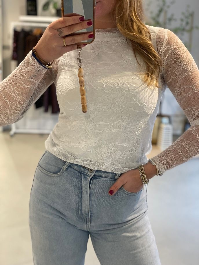 Wij zijn verliefd op deze prachtige Bibi kanten top in het wit. De top is romantisch, sophisticated en kan ook stoer gedragen worden. Deze kanten blouse is perfect voor onder een blazer, trui of vest. Draag de blouse op een spijkerbroek, rokje of pantalon met sky high heels of met stoere boots en jouw look is compleet. Helemaal perfect om casual te dragen of voor een feestje. Deze gehaakte kanten top heeft lange mouwen maar draagt heerlijk luchtig.