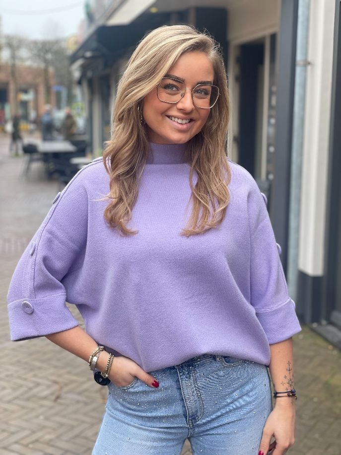 De Demi trui in de kleur paars is een stijlvolle must-have voor elk seizoen. De trui heeft een subtiele kleine turtleneck die zorgt voor een elegante uitstraling zonder in te leveren op comfort. De knopen op de mouwen geven de trui een speelse en vrouwelijke touch, waardoor de trui net dat beetje extra krijgt.
