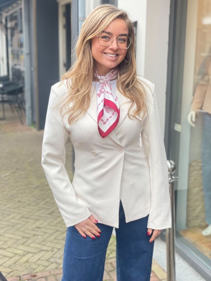 De lichte off white kleur maakt deze blazer perfect voor een lente outfit: draag ’m als onderdeel van een stijlvol lente pak, of combineer hem moeiteloos met een jeans, pantalon of rok. Zowel geschikt voor zakelijke gelegenheden als voor een casual-chique look.