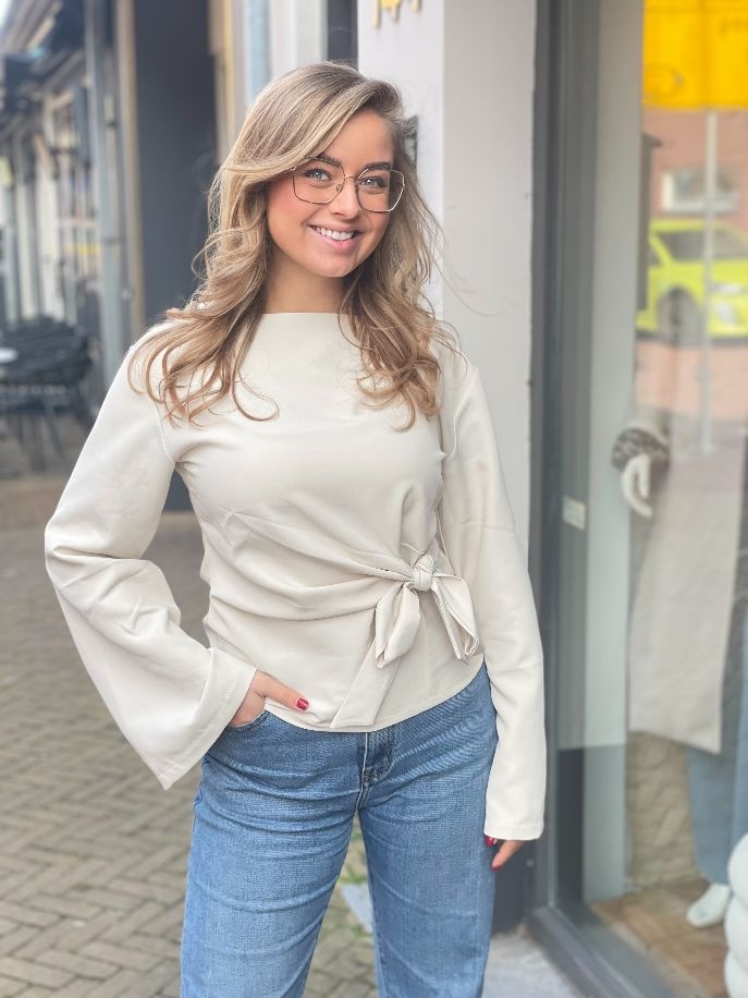 Deze elegante strik top in het off white is de perfecte combinatie van vrouwelijkheid en verfijning. De subtiele strik aan de voorzijde geeft de top een speelse en luxe uitstraling, terwijl de wijd uitlopende mouwen zorgen voor een sierlijk en trendy silhouet.