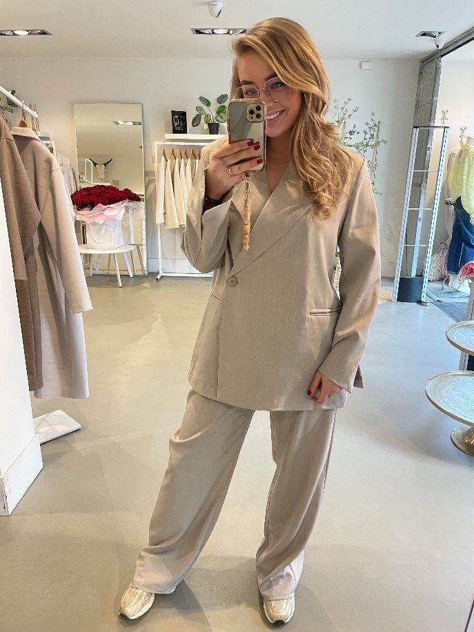 Het Office Suit Tweedelig in taupe is een stijlvol oversized damespak, bestaande uit een blazer en bijpassende broek. Dankzij de comfortabele oversized pasvorm combineert het moeiteloos elegantie met een moderne, casual chic uitstraling. Perfect voor werk, zakelijke afspraken of een stijlvolle daglook. Voeg een tijdloos en veelzijdig mode-item toe aan je garderobe en shop het nu online.