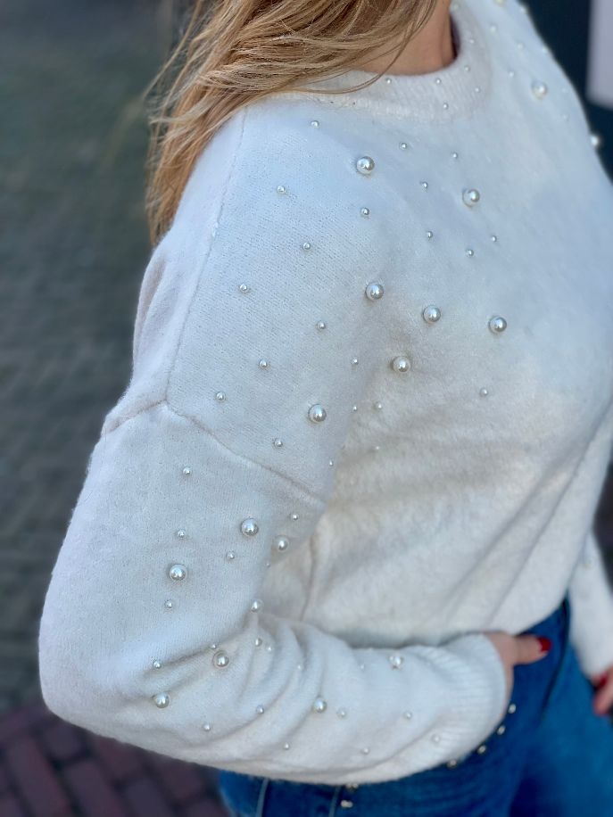 Deze elegante off white pareltrui is een perfecte combinatie van comfort en stijl. De subtiele parels op de schouders en mouwen geven de trui een vrouwelijke en luxe uitstraling, waardoor je outfit net dat beetje extra krijgt.